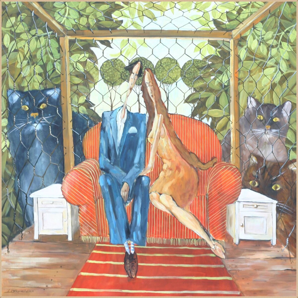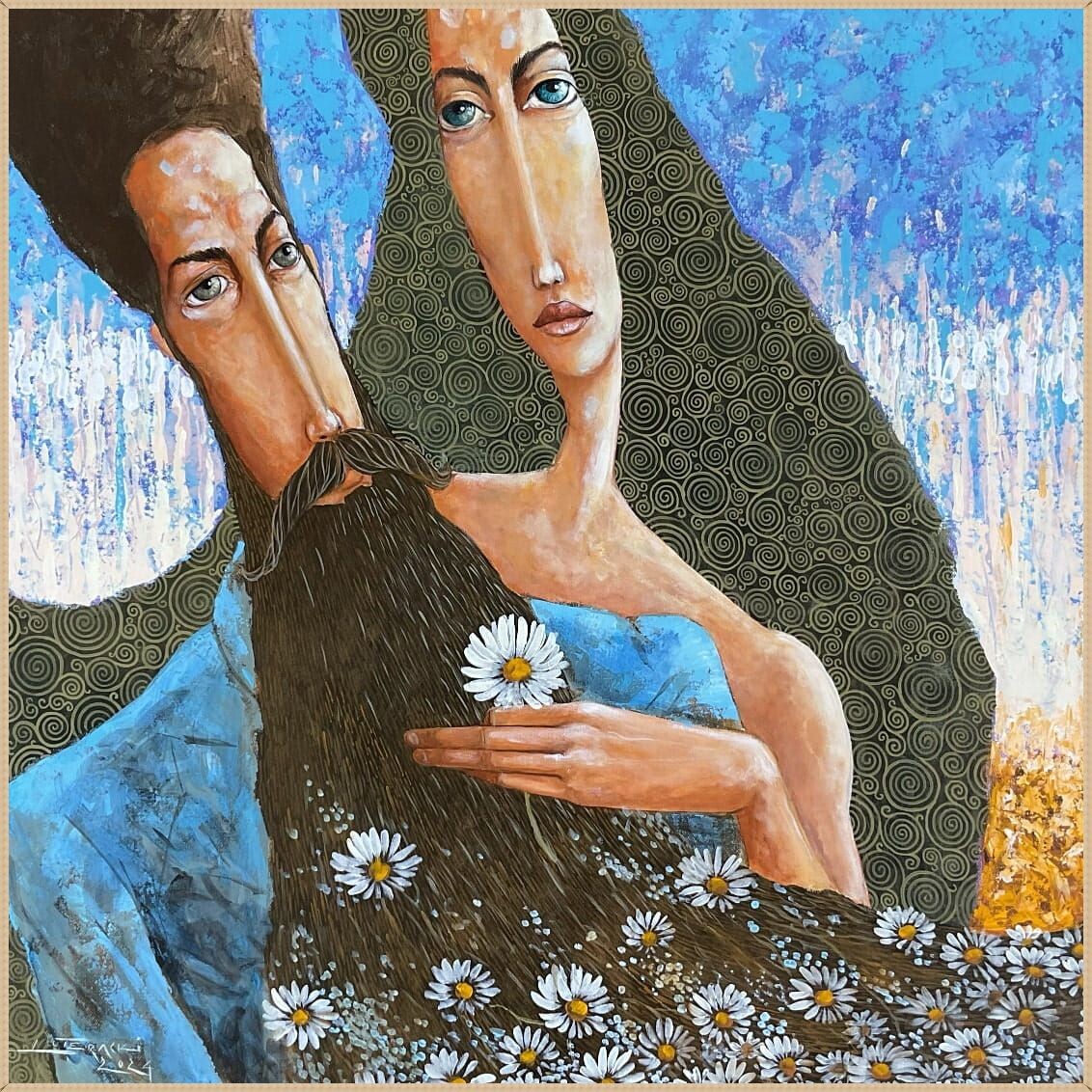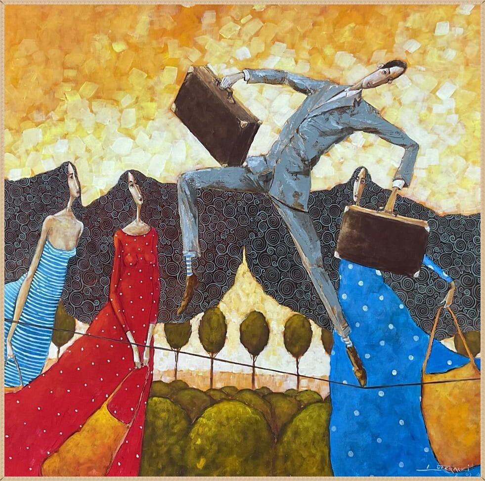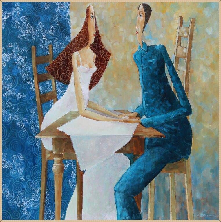 Пожалуй, центральной фабулой его работ является обращение внимания на суть отношений между людьми (чаще женщиной и мужчиной) в тот текущий момент, который представлен на картине. Здесь значимым может стать и орнаментальный узор фона и ряд символов. К тому же подсказкой для расшифровки смысла ряда работ является чувство юмора, присущее художнику.