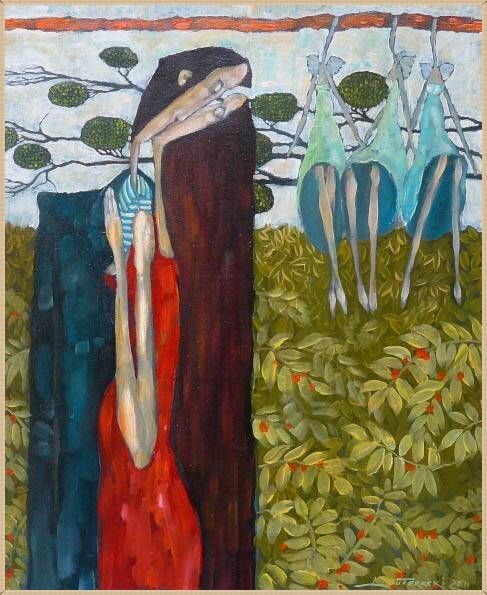 Работы художника из Польши отличается лаконизмом. В ряде работ фон представлен орнаментом, словно созданным из волос главной героини. А, по сути, это маленькая история из ситуации, случившаяся с героиней картины. Поэтому для понимания фабулы ситуации очень важен точный перевод названия работ.